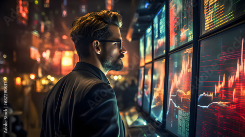 A financial manager stands in front of digital stock market charts (Generative AI)