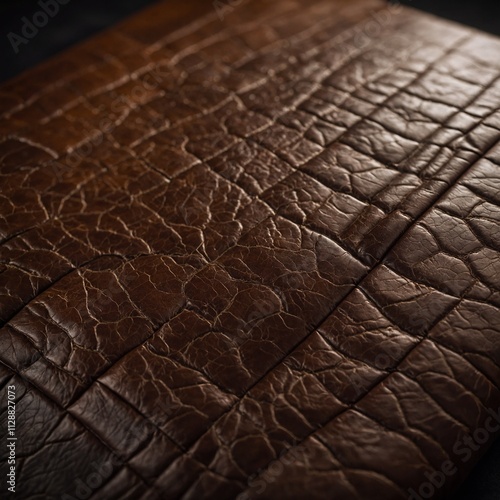 A finely textured leather surface, highlighted by light, set against a blurred luxury setting.
