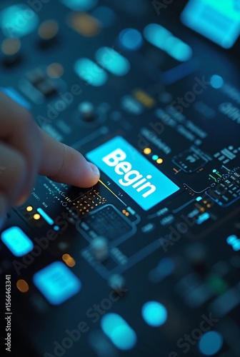 A finger presses a prominent blue glowing button labeled "Begin" on a futuristic technology interface panel, vertical composition.