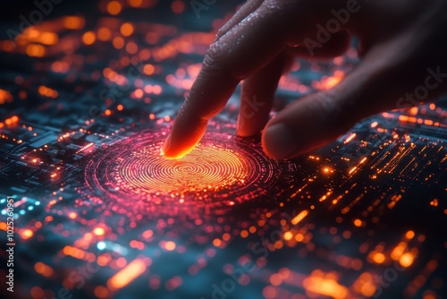 A finger presses on a glowing fingerprint scanner, activating security access.
