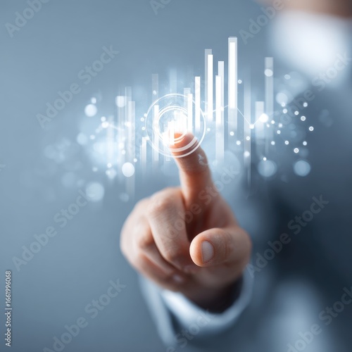 A fingertip interacts with a translucent holographic display showing dynamic bar graphs and data points, suggesting technological control and data analysis