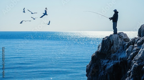 A fisherman standing on a rocky cliff, casting his line into the deep blue ocean while seagulls circle above.