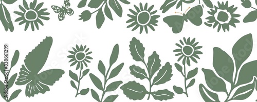 A flat design background featuring sunflowers and butterflies arranged to create a border with ample free copy space in the center for text