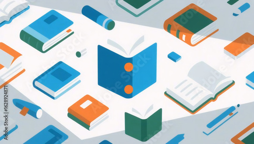 A flat design illustration of various books and objects arranged in a repeating pattern