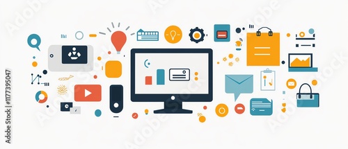 A flat lay design featuring a digital device screen, work tools, and business idea elements, placed on a clean white desk background