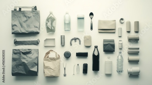 A flat lay of eco-friendly items such as reusable bags, bottles, and recycling bins, placed on a clean white background