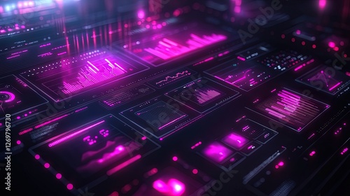 A flat lay of futuristic glowing dashboards with analytical charts and graphs, clean and technological