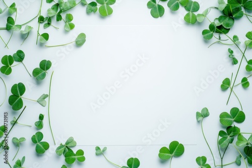 A flat lay of green clovers framing a blank space for text or design.