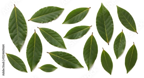 A flat lay of several fresh green bay leaves scattered on a white background surface
