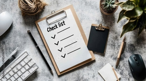 A flat lay shows a checklist on a clipboard with a plant, keyboard, and pen on a gray concrete table, creating an organized and stylish office environment