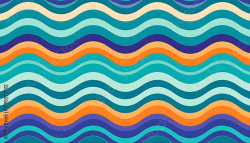 A flat psychedelic vector illustration of a seamless pattern of flowing waves in a rare and vibrant color palette of teal, orange, and violet