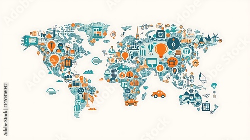 A flat world map design with outlined continents in light gray, overlaid with colorful icons of workers—nurse, engineer, farmer, builder—positioned across various countries,