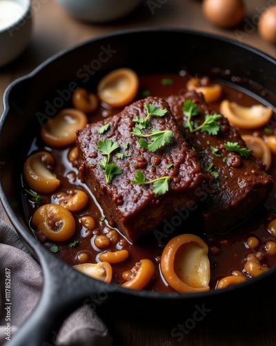 A flavorful meatloaf topped with fresh herbs and surrounded by apricot halves and sauce in a black cast-iron skillet