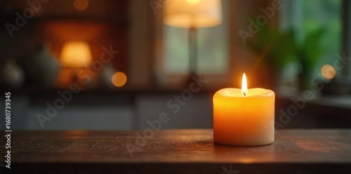 A flickering candle casts a warm, inviting glow on a wooden surface indoors, creating a cozy and serene atmosphere Perfect for home decor, relaxation, and spa themes , still life, ambiance