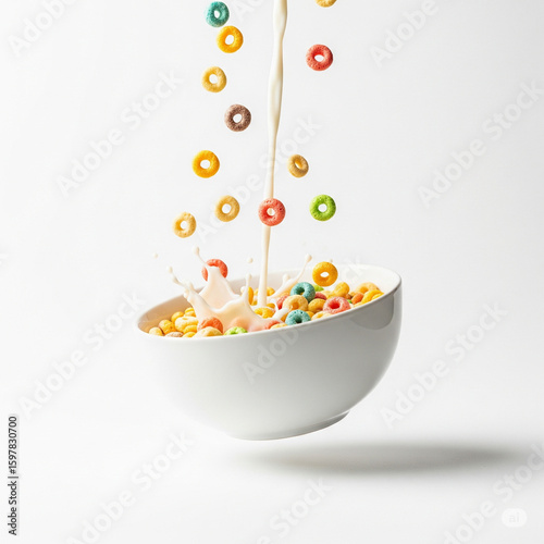 A floating bowl of cereal with pouring milk isolated on white