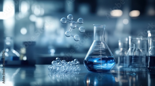 A floating chemical formula over a dark laboratory background.