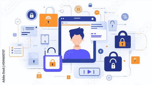 A floating user profile surrounded by padlocks, key symbols, and lines of encrypted code, emphasizing secure identity and data protection online.