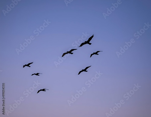 A flock of birds soars across the sky at twilight, their dark silhouettes standing out against the deepening shades of blue and purple.