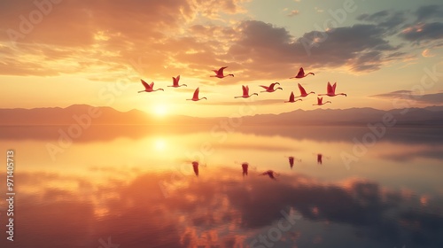 A flock of flamingos flying over a shimmering salt flat at sunset
