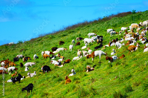 A flock of goats is feeding on lush grass on a steep slope to reduce the risk of brush fires and minimize the threat of wildfires.