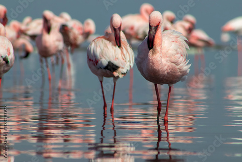 A flock of pink flamingos standing by a serene lake under a clear blue sky. A beautiful scene of nature, perfect for ecology, wildlife, and travel-related projects.