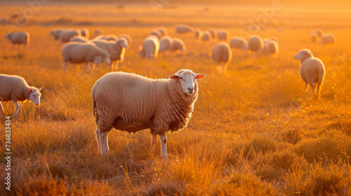 A flock of sheep graze in a field their fluffy coats lit up by the warm golden light of the countryside.