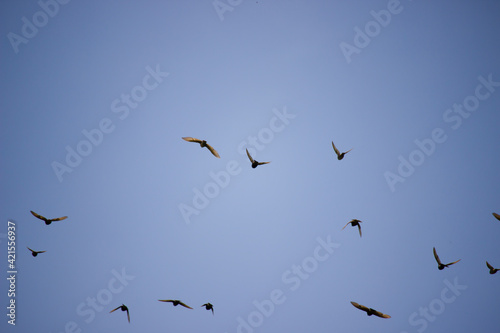 A flock of starlings flying in the sky. Background blue clear sky. Birds in the wild. A sunny summer day.