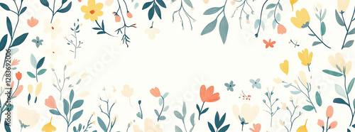 A floral border design featuring various colorful flowers and leaves on a light background.