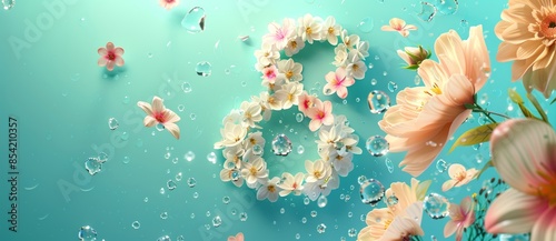 A floral card for March 8th. Yellow flowers blowing in the wind on a blue background. Stock.