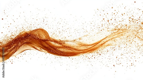 A flowing stream of brown liquid, suspended mid-air against a white backdrop, with scattered droplets creating a dynamic, elegant swirl