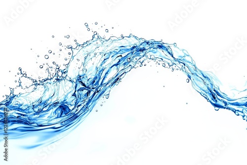 A flowing water splash with droplets and bubbles captured mid-motion on a clean white background. Concept of freshness, clarity, and purity. Ai generative