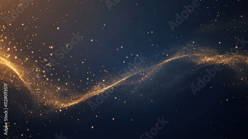 A flowing wave of golden glitter sparkles against a dark backdrop, offering a captivating space suitable for text or creative designs. Generative AI