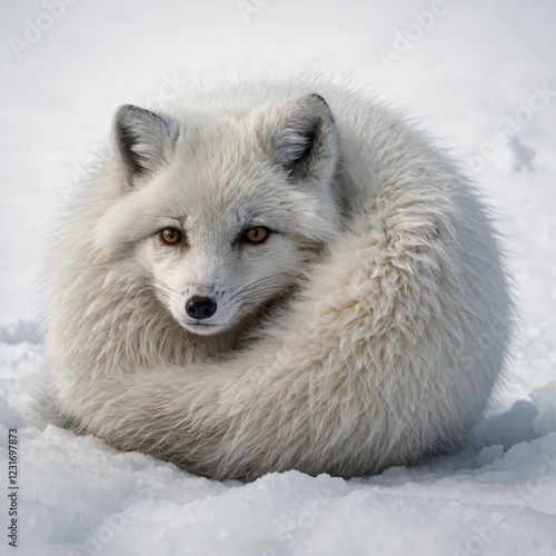 A fluffy Arctic fox curled up in a ball, blending into the white background.