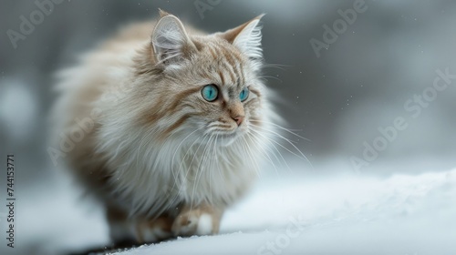 A fluffy cat with blue eyes walking in the snow. Generative AI.