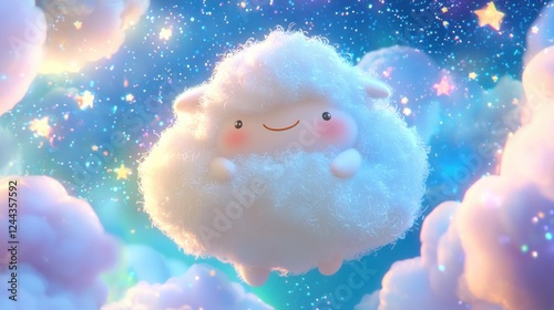 A fluffy cloud sheep floats among the stars, a whimsical night scene filled with dreamy pastel colors and twinkling lights.