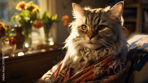 A fluffy gray cat wearing a floral scarf is sitting on a couch and looking at the camera.