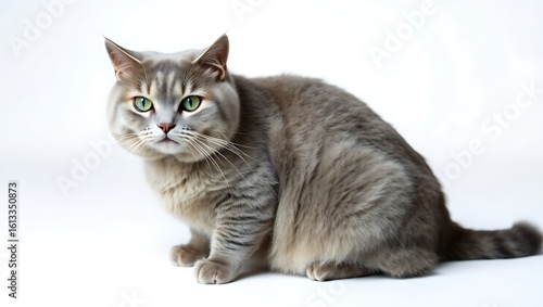 A fluffy gray cat with green eyes sitting on a white background looking at the camera intently posing