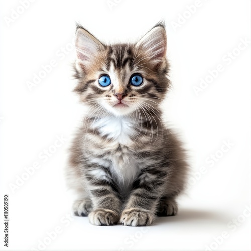 A fluffy grey kitten with blue eyes sitting gracefully on a white background, looking curious and playful