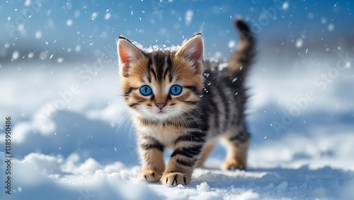A fluffy kitten with blue eyes walks playfully through a blanket of fresh, white snow