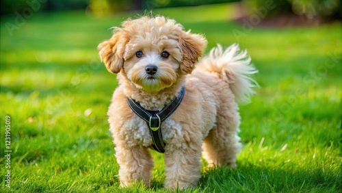 A fluffy Poochon puppy, airborne, in a black harness, enjoys a verdant park.