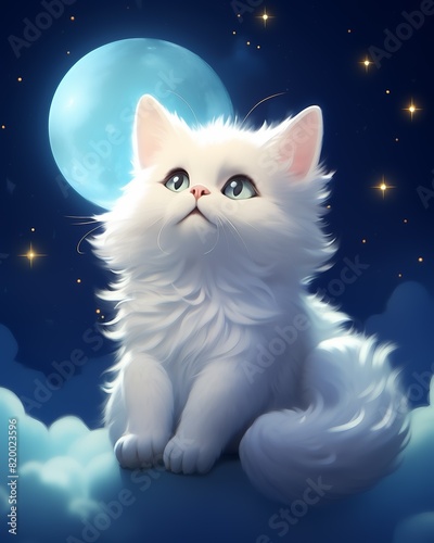A fluffy white kitten gazes up at a glowing moon in the night sky, surrounded by stars and clouds.