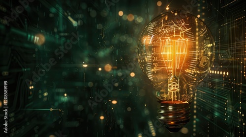 A fluorescent light bulb with a filament replaced by a circuit board. It radiates energy against the dark background of the digital data stream. It is a symbol of innovation.