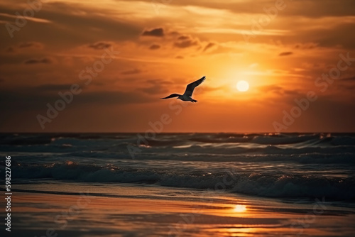 A flying seagull silhouette in sunset sky and beach. AI generative