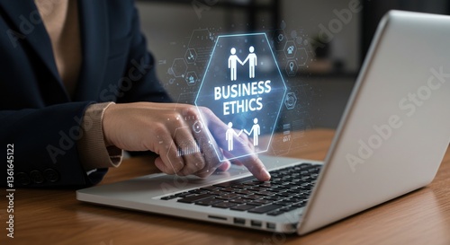 A Focus on Business Ethics: A Professional Adult Engages with Digital Ethical Practices on a Laptop, Highlighting the Importance of Ethical Standards in Corporate Environments