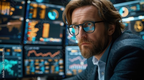 A focused analyst analyzes data on a computer, surrounded by multiple screens displaying charts and graphs