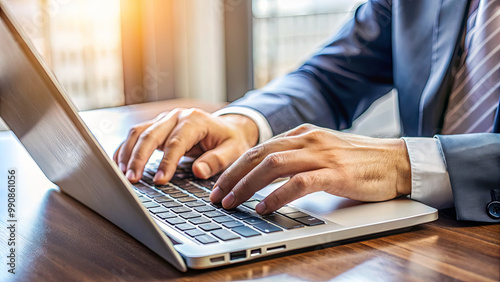 A focused business professional is engaged in typing on a laptop against a backdrop of a bright office, with sunlight streaming through the windows in the afternoon