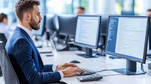 A focused business professional types on a keyboard at a desk, utilizing dual monitors to manage tasks in a contemporary office environment filled with natural light