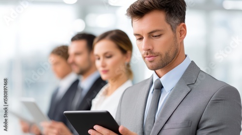 A focused businessman in a suit uses a tablet while three blurred colleagues stand behind him, all engaged with digital devices in a modern office setting.