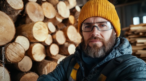 A focused craftsman in protective gear poses confidently among neatly stacked logs, embodying dedication and skill in woodworking amidst a warm, rustic backdrop.