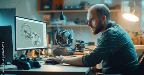 A focused engineer working on a 3D model design displayed on a computer screen in a modern office